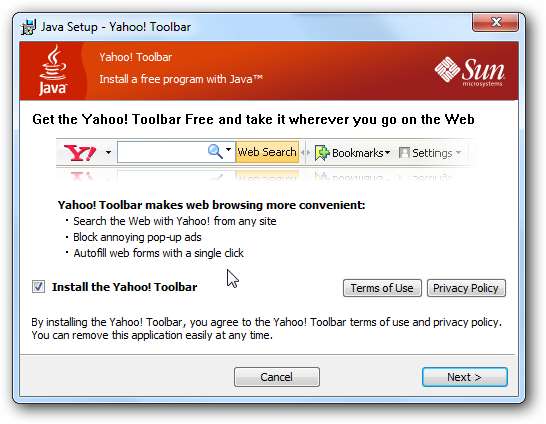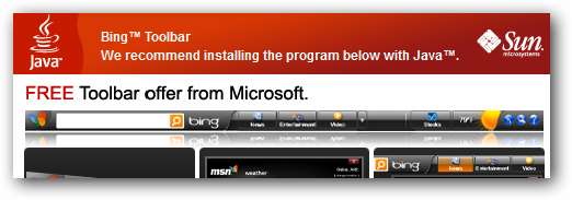 ג'אווה של Sun מנסה להתקין דברים נוספים כמו שבדוגמה זו הם רוצים להכניס את סרגל הכלים של בינג ל- Internet Explorer עבורך ...