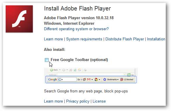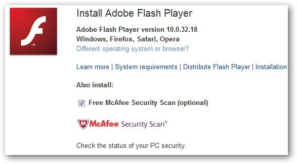 קיום רוכבי תוכנה נוספים הוא מקום נפוץ באפליקציות כמו RealPlayer או iTunes ובאפליקציות אחרות של "Lameware", אך כעת זה מחמיר. כאשר אנו מקבלים את הגרסה האחרונה של Flash Player בהתקנת Windows 7, אנו רואים שהם מנסים להוסיף תוכנה נוספת כמו סרגל הכלים של גוגל, או גרוע מכך, סריקת Mcafee.