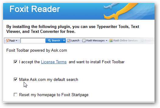 או Foxit Reader שרוצים להתקין את סרגל הכלים שלהם ולהפוך את Ask.com לחיפוש ברירת המחדל שלך. בהערה צדדית, שמתם לב איך נראה שפוקסיט הנפוח מקבל בגרסאות האחרונות?