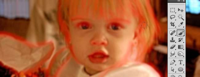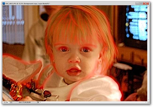 אתה מבטל את כל מה שעשית בדיוק מהתדמית שלך, ואז מצייר בחזרה באזורים שאתה רוצה לשמור. הקצוות עובדים הכי טוב, כפי שמוצג כאן באדום. על ידי ציור בקצוות, אתה נותן לתמונה הרכה אשליה של חדות. בדרך זו תוכלו לתקן באופן סלקטיבי את האזורים המטושטשים והרכים מדי, תוך שמירה על החלקים הרכים שחסרים להם את התבואה בתמונה.