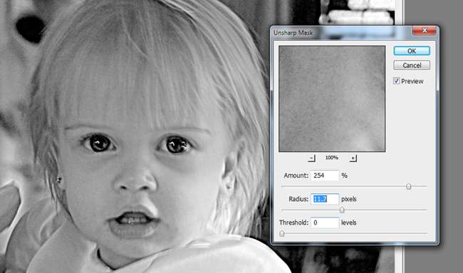 בסולם האפור הזה, נווט אל מסנן> השחז> מסכה לא חדה. הגדרות אלה מגזימות בצורה קשה את השחזות שלנו, ומביאות ללא כוונה מרקם גרגרים בתדמית שלנו. תוכלו להשתמש בהגדרות המוצגות כאן, אך להתאים אותן בהתאם לצרכים שלכם. זכור, להגזים בשלב זה זה בסדר, להיות קיצוני, אם יש צורך.