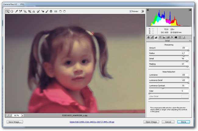 כחלופה לשימוש במסנן Unsharp Mask לביצוע התאמות לחדות התמונה שלך, תוכל לבצע התאמות מאוד משובחות באמצעות Adobe Camera Raw או Lightroom. משתמשי Photoshop יכולים למצוא אותו על ידי ניווט אל קובץ> פתח בשם, ואז בחירת JPG כלשהו ושימוש בהגדרה "Camera Raw". בתוכנית Camera Raw, השתמש ב-