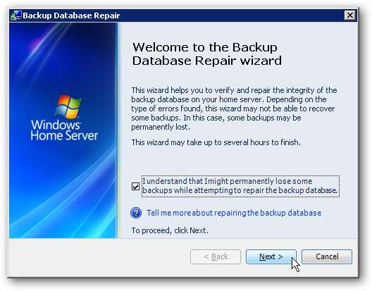 האשף יופעל ותצטרך להסכים שתאבד נתונים במהלך תיקון מסד הנתונים של הגיבוי.