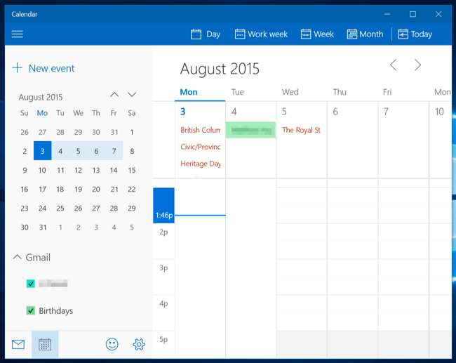 אפליקציית לוח השנה החדשה השתפרה בהרבה מ- Windows 8.1. בנוסף ליומני Outlook.com ויומני Exchange, תוכל גם לחבר את לוחות השנה של גוגל ואפל iCloud לאפליקציית היומן. יש תצוגות יום, שבוע עבודה, שבוע, חודש והיום לצפייה באירועים שלך. זה עובד גם עם אריחים חיים, ומספק לך תצוגה מהירה של האירועים הקרובים שלך.