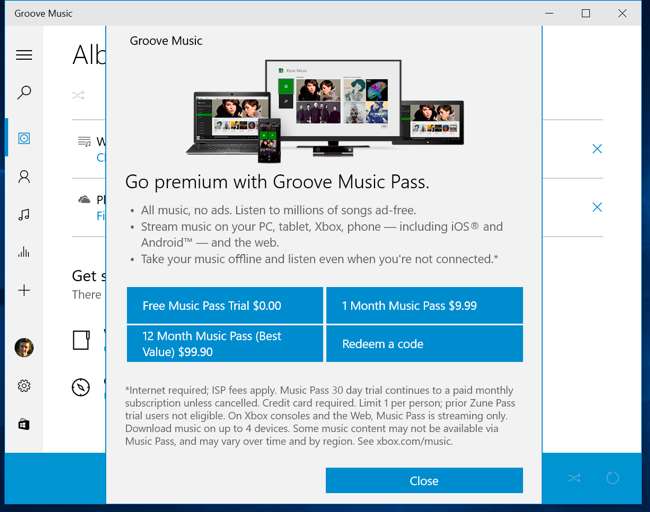 יישום זה מאפשר לך לנגן מוסיקה הממוקמת במחשב שלך, כמו גם קבצי מוסיקה שאחסנת ב- OneDrive. זה גם מאפשר לך לרכוש "Groove Music Pass", שמתפקד כמו מנוי Apple Music או Spotify שנותן לך גישה למיליוני שירים בתשלום חודשי.