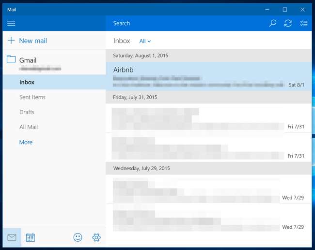 גם אפליקציית הדואר משופרת בהרבה. הוא מקושר לאותו חשבון שבו אתה משתמש באפליקציית לוח השנה, מה שאומר שאתה יכול להוסיף כאן חשבונות Outlook.com ו- Echange וכן חשבונות דוא"ל של גוגל ואפל iCloud. הוא תומך גם ביאהו! דואר, כל חשבון IMAP ואפילו חשבונות POP - דבר שלא היה אפשרי באפליקציית הדואר ב- Windows 8. החלקות, גרירה ושחרור ותכונות שונות אחרות פועלות בדיוק כמו שהיית מצפה מהם. זוהי דרך קלה ופשוטה לבצע דואר אלקטרוני ומציעה אריח חי.