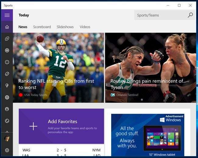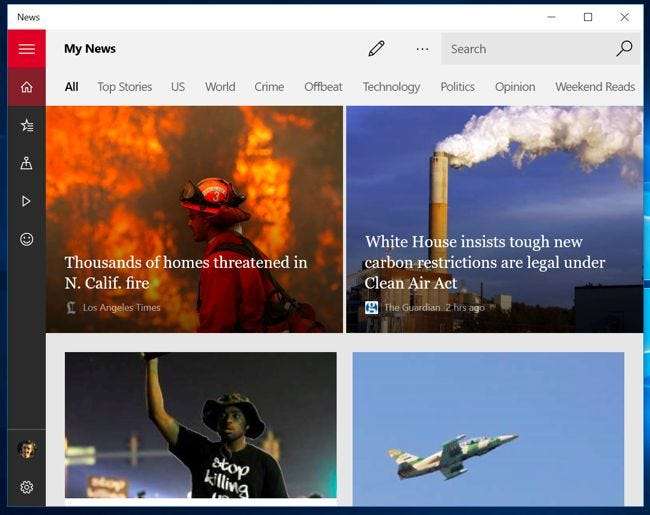 אפליקציית החדשות היא בעצם אתר MSN חדשות של מיקרוסופט בצורה של אפליקציה. בנוסף להצגת סיפורי החדשות המובילים כמו חדשות Google, תוכל גם להתאים אישית את תחומי העניין שלך ולראות חדשות מקומיות. אפליקציית החדשות ב- Windows 8 אפשרה להוסיף כל עדכון RSS לקריאה באפליקציה, אך נראה כי תכונה זו כבר אינה זמינה - אלא אם כן היא קבורה ומוסתרת במקום אחר באפליקציה.