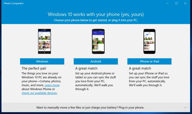 אפליקציית Phone Companion מנחה אותך בתצורת הטלפון החכם או הטאבלט שלך - Windows, Android, iPhone או iPad - לעבודה עם Windows 10. היא באמת נועדה לעודד אותך להתקין את היישומים השונים של מיקרוסופט כך שהשירותים שאתה עשוי להשתמש בהם במחשב שלך יהיה זמין גם בטלפון שלך. לדוגמה, אמירת האפליקציה שיש לך טלפון אנדרואיד או iPhone מציעה להתקין את OneDrive, Skype, OneNote, Outlook ו- Microsoft Office ליישומי Android.