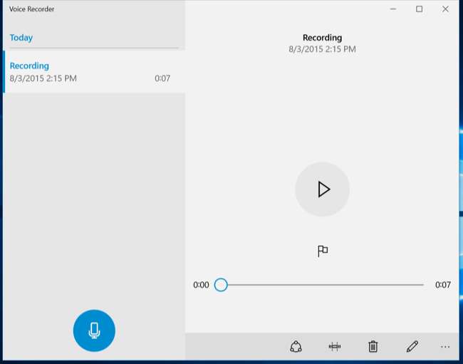 אפליקציה אחרת שנמצאת יותר בבית בסמארטפון, מקליט קולי מציג רק מסך לבן עם כפתור מיקרופון כשפותחים אותו. לחץ או הקש על סמל המיקרופון כדי להתחיל בהקלטה ואז לחץ או הקש על כפתור העצירה לאחר שתסיים. השתמש באפליקציה זו כדי להקליט במהירות את הקול שלך וצלילים אחרים באמצעות המיקרופון של המחשב האישי שלך.