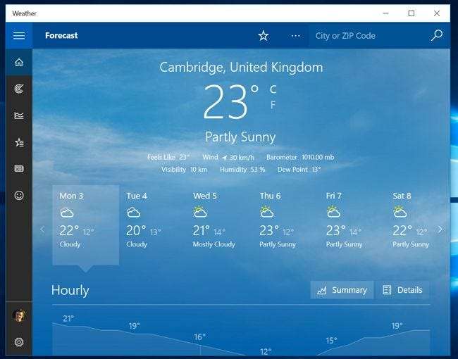 זו הייתה אחת האפליקציות האטרקטיביות ביותר ב- Windows 8, והיא עדיין קיימת ב- Windows 10. היא מספקת תחזיות מזג אוויר עבור מיקומים לפי בחירתך יחד עם נתוני מזג אוויר היסטוריים וחדשות הקשורות למזג האוויר מ- MSN. הוסף מספר מיקומים וראה את מזג האוויר המקומי בממשק נוח. אפליקציית מזג האוויר מספקת אריח חי נוח במיוחד שיציג את מזג האוויר המקומי בתפריט התחל שלכם.