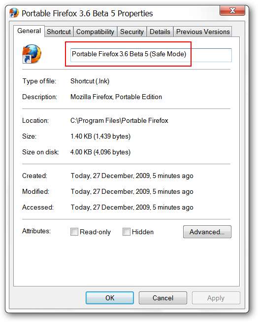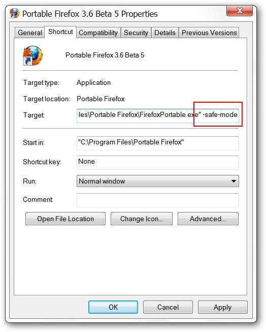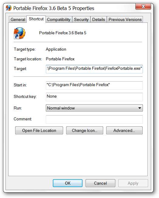 הערה: שינוי קיצור דרך זה שבוצע בהתקנות Portable Firefox מ- portableapps.com.