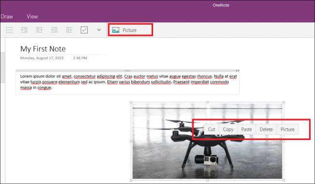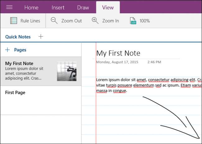 אחרי שהגדרת את הדפים שלך ואתה מוכן להתחיל ליצור הערות משלך, תוכל להבחין ש- OneNote עובד בצורה קצת 'אלבום תמונות', שבו כולם יכולים להיות טקסט, תמונות ואפילו ציורים. מחולקים יחד באותה פתק כדי ליצור לוח שעם של רעיונות שונים ומושגי סיעור מוחות במקום אחד. אם אתה רוצה לכסות תמונות על גבי טקסט, OneNote לא ימנע ממך. צריך לשרבט כמה תוספות בראש רשימת המכולת של מישהו? OneNote תואם לטאבלט ועט, או שאתה יכול אפילו להשתמש בעכבר אם אתה מרגיש אמנותי במיוחד.