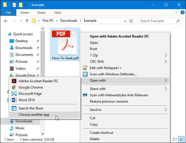באפשרותך גם לפתוח קבצי PDF בכונן הקשיח בדפדפן האינטרנט המועדף עליך. לדוגמה, נניח שאתה רוצה לפתוח קבצי PDF ב- Chrome. פשוט אתר קובץ .PDF במחשב שלך, לחץ עליו באמצעות לחצן העכבר הימני ובחר פתח באמצעות> בחר יישום אחר.