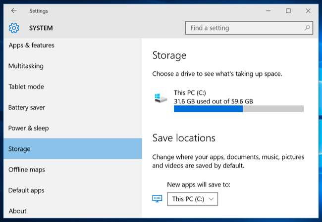 התכונה המאפשרת לך להתקין אפליקציות Windows 10 בכונן אחר - למשל, כרטיס SD בטאבלט או במחשב נייד עם כמות אחסון קטנה - הופעלה מחדש. תמצא אותו ב הגדרות> מערכת> אחסון.
