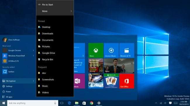 יישומים ואריחים של Windows 10 יכולים לכלול כעת רשימות ג'אמפ, ותוכלו להציג אריחים נוספים בתפריט התחל. התערובת המוזרה של Windows 10 של סגנונות תפריט ההקשר שופרה, והם עקביים יותר - בתפריט התחל ובשאר שולחן העבודה.