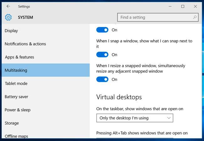אתה יכול גם להפעיל את התכונה "כאשר אני משנה גודל של חלון שהופעל, בו זמנית לשנות את גודל כל חלון מצורף סמוך" תחת הגדרות> מערכת> ריבוי משימות. אם תעשה זאת, תוכל לגעת (או ללחוץ) ולגרור את הידית בין שתי אפליקציות זו לצד זו והיא תשנה את גודלן של שתיהן בבת אחת, בדיוק כמו שינוי גודל של שתי אפליקציות מטרו ב- Windows 8.