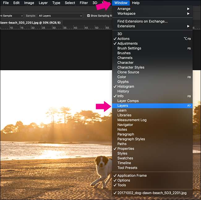 מאז הממשק של פוטושופ כל כך ניתן להתאמה אישית , קל מאוד לסגור או למקם בטעות פאנל חשוב כמו פאנל השכבות. אם אינך יכול לראות זאת, כל שעליך לעשות הוא לעבור לתפריט חלון. כל החלוניות המוצגות כעת מסומנות בסימון. כדי לחשוף את לוח השכבות, לחץ על שכבות.