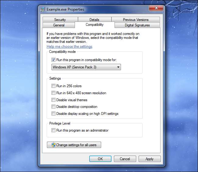 השתמש בהגדרות התאימות של Windows : ל- Windows יש הגדרות מצב תאימות מובנות שיכולים לעזור לתוכניות לעבוד. לחץ באמצעות לחצן העכבר הימני על קיצור הדרך של תוכנית, בחר מאפיינים ולחץ על הכרטיסיה תאימות. אתה יכול לבחור את גרסת Windows שתוכנית פועלת תחתיה - Windows תנסה להונות את התוכנית הזו לחשוב שהיא פועלת בגירסה הישנה של Windows. זה לא תמיד יאפשר לכל תוכנית ישנה לעבוד, אבל זה שווה זריקה. יש אפילו פותר בעיות תאימות תוכניות שינסה למצוא באופן אוטומטי את הגדרות מצב התאימות הנכונות עבור התוכנית שלך.