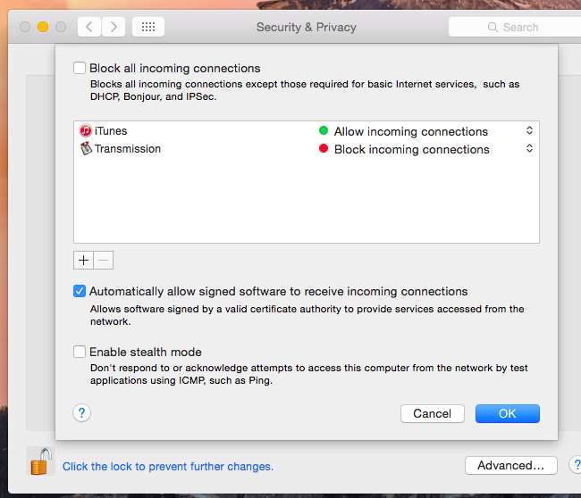 הגדרת ברירת המחדל היא "הרשה אוטומטית לתוכנה חתומה לקבל חיבורים נכנסים", כלומר כל היישומים של Apple ב- Mac שלך, האפליקציות מחנות היישומים של Mac ואפליקציות חתומות מותר דרך הגנת GateKeeper של ה- Mac שלך מותר לקבל חיבורים ללא קלטך. (במילים אחרות, לאפליקציה של "מפתח מזוהה" יש חתימה תקפה.)