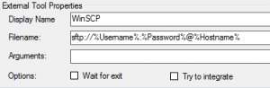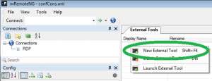उपरोक्त सभी को आसानी से mRemoteNG के "बाहरी उपकरण" सुविधा के माध्यम से नकारा जा सकता है। इस सुविधा के साथ, WinSCP को आमंत्रित करना और उसके सभी कनेक्शन विवरणों को पास करना संभव है जो mRemoteNG के पास पहले से हैं।