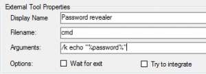 जैसा कि हमने ऊपर दिखाया है, एक और "बाहरी टूल" जोड़ें, केवल इस बार आप टूल को "पासवर्ड रिवीलर" नाम देंगे और "फ़ाइलनाम" फ़ील्ड केवल "cmd" निर्देश को दबाए रखेगा। हालांकि, पिछले उदाहरण के विपरीत, आप नीचे दिए गए "तर्क" पंक्ति को भरेंगे: