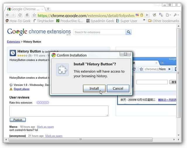 इंस्टॉल प्रक्रिया के दौरान आपको एक्सटेंशन की स्थापना की पुष्टि करने के लिए कहा जाएगा। Chrome में अपना नया "इतिहास बटन" जोड़ने के लिए "इंस्टॉल करें" पर क्लिक करें।