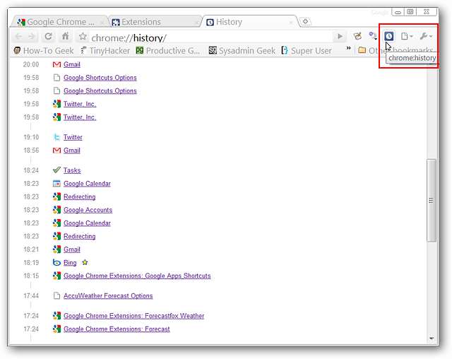 हालांकि यह कुछ ऐसा नहीं हो सकता है जो हर किसी को पसंद आएगा, इतिहास बटन एक्सटेंशन उन लोगों के लिए क्रोम के लिए बहुत अच्छा जोड़ देता है जो मेनू या कीबोर्ड शॉर्टकट के बजाय टूलबार बटन का उपयोग करना पसंद करते हैं।