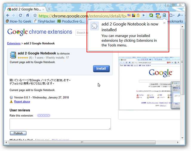 जैसे ही स्थापना प्रक्रिया समाप्त हो गई है आप अपने नए "टूलबार बटन" और एक संक्षिप्त विस्तार प्रबंधन संदेश देखेंगे। चिंता करने का कोई विकल्प नहीं है और आप तुरंत उन नए नोटों को जोड़ने की शुरुआत कर सकते हैं।