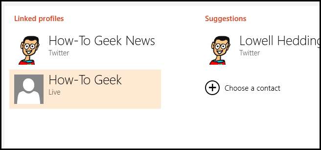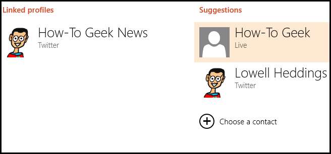 विंडोज 8 वास्तव में बहुत स्मार्ट है और यह अनुमान लगाने की कोशिश करेगा कि आप किस संपर्क को लिंक करने की कोशिश कर रहे हैं, और अधिकांश भाग के लिए यह सही है। तो बस आगे बढ़ें और दाहिने हाथ की तरफ एक विकल्प चुनें।