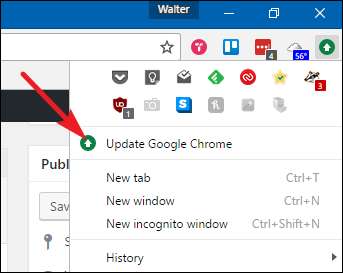 लेकिन, यदि आप हमारी तरह हैं, तो संभवतः आपके पास अधिकांश समय Chrome विंडो खुली रहती है। यदि क्रोम के लिए कोई अपडेट उपलब्ध है, तो आपको टूलबार में हरे रंग के तीर में दाईं ओर स्थित विकल्प आइकन दिखाई देगा।