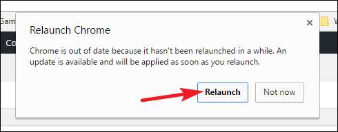 Chrome आपको चेतावनी देता है कि अपडेट को लागू करने के लिए उसे पुन: लॉन्च करने की आवश्यकता है, इसलिए जारी रखने के लिए "Relaunch" बटन पर क्लिक करें।