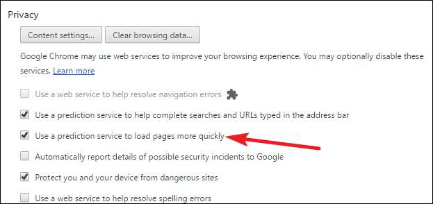 "गोपनीयता" अनुभाग में, "अधिक तेज़ी से पृष्ठों को लोड करने के लिए एक भविष्यवाणी सेवा का उपयोग करें" विकल्प चुनें।