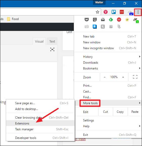 दुर्भाग्य से, कुछ एक्सटेंशन अपने टूलबार आइकन के माध्यम से अनइंस्टॉल करने का विकल्प प्रदान नहीं करते हैं, और बहुत कम ही आपको उस तरह के एक्सटेंशन को अक्षम करने की अनुमति देते हैं। हालाँकि, आप विकल्प मेनू पर क्लिक करके और फिर अधिक उपकरण> एक्सटेंशन का चयन करके सभी स्थापित एक्सटेंशन की सूची तक पहुँच सकते हैं।