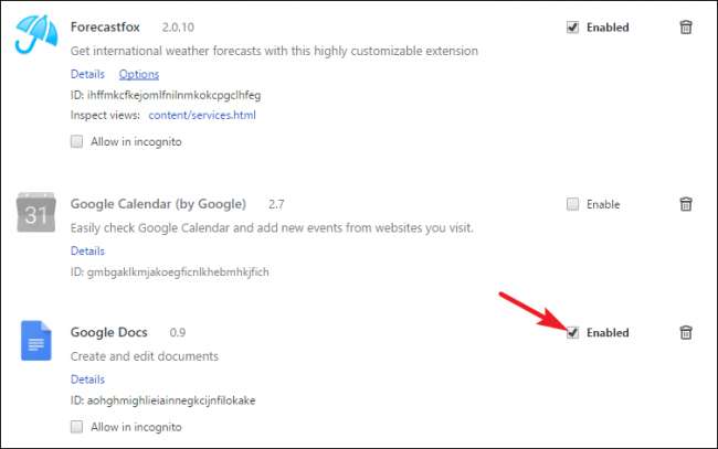 एक्सटेंशन को अक्षम करने के लिए, एक्सटेंशन के शीर्षक के दाईं ओर "सक्षम" विकल्प को अनचेक करें। जब आप किसी एक्सटेंशन को अक्षम करते हैं, तो आप विकल्प को फिर से चालू करके इसे फिर से सक्षम कर सकते हैं। आप ट्रैश आइकन पर क्लिक करके एक्सटेंशन को पूरी तरह से अनइंस्टॉल भी कर सकते हैं। अक्षम किए गए कुछ एक्सटेंशन के साथ, आपको गति में महत्वपूर्ण अंतर की उम्मीद करनी चाहिए।