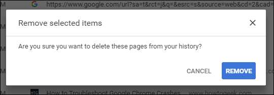 एक पुष्टिकरण संवाद बॉक्स प्रदर्शित करता है। "हटाएं" पर क्लिक करें यदि आप सुनिश्चित हैं कि आप इतिहास सूची से वेबपृष्ठों को हटाना चाहते हैं।