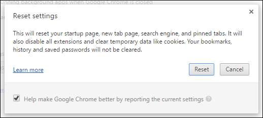 टूल को संदेहास्पद प्रोग्राम मिलते हैं या नहीं, जब वह चालू होता है, तो क्रोम पुनः आरंभ करेगा और आपको अपनी सभी क्रोम सेटिंग्स को रीसेट करने का विकल्प देगा। यदि आप ऐसा करते हैं, तो यह आपके स्टार्टअप पृष्ठ, नया टैब पृष्ठ, खोज इंजन और पिन किए गए टैब को रीसेट कर देगा। यह अक्षम कर देगा - लेकिन कोई एक्सटेंशन नहीं हटाएगा - और यह कुकीज़ की तरह अस्थायी डेटा को साफ़ करेगा। यह आपके बुकमार्क, सहेजे गए पासवर्ड या ब्राउज़िंग इतिहास को साफ़ नहीं करेगा।