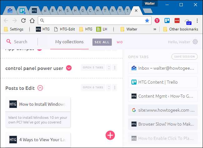 यदि आप एक दृष्टिकोण पसंद करते हैं जो उन टैब को आपके रास्ते से बाहर कर देता है, तो नाम का एक और शानदार एक्सटेंशन है टोबी । आप इसे खुले टैब और बुकमार्क के बीच में कहीं बैठकर सोच सकते हैं। यह आपके नए टैब पेज को टैब मैनेजर से बदल देता है। एक नया टैब खोलने पर क्लिक करें, और आप आसानी से किसी भी खुले टैब को विभिन्न समूहों में खींच सकते हैं। आप एक टैब को फिर से क्लिक कर सकते हैं या एक ही समय में एक समूह में सभी टैब खोल सकते हैं। आप क्रोम विंडो में एक क्लिक के साथ एक सत्र के लिए सभी खुले टैब को भी सहेज सकते हैं।