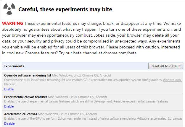 क्रोम के स्थिर रिलीज संस्करण के साथ कई प्रयोगात्मक विशेषताएं शामिल हैं; वे डिफ़ॉल्ट रूप से सक्षम नहीं हैं। और उसके लिए एक अच्छा कारण है। प्रायोगिक विशेषताएं अस्थिर हो सकती हैं, जिससे अजीब कीड़े या दुर्घटनाग्रस्त हो सकते हैं। अपने सबसे खराब समय में, इन प्रायोगिक का उपयोग करते समय बग्स सुरक्षा और गोपनीयता से समझौता कर सकते हैं, या यहां तक कि ब्राउज़िंग इतिहास जैसे डेटा को भी निकाल सकते हैं और एक बुरी दुर्घटना में पासवर्ड को सहेज सकते हैं।
