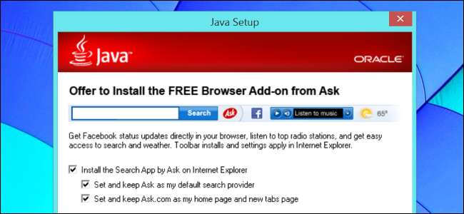 ओरेकल का जावा अपडेटर भी बंडल करता है टूलबार से पूछें जावा के लिए सुरक्षा अपडेट में, इसलिए इंस्टॉल करते समय सावधान रहें - या, बेहतर अभी तक, यदि आपको इसकी आवश्यकता नहीं है तो जावा की स्थापना रद्द करें । अधिकांश कार्यक्रमों में सुरक्षा अपडेट में जंकवेयर नहीं मिला।