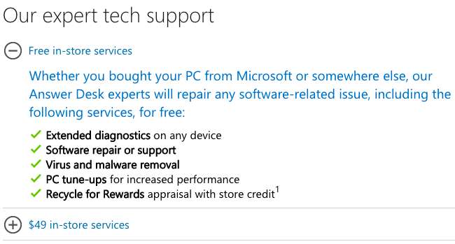 वे $ 49 भुगतान की गई सेवाएं संभावित रूप से उपयोगी होती हैं, जैसे "वारंटी कंसीयज" सेवा, जहां Microsoft स्टोर के कर्मचारी आपके पीसी के निर्माता के साथ इसे वारंटी के तहत तय करने के लिए डील करेंगे, इसलिए आपके पास नहीं है उनसे लड़ो , बेतुका करने के लिए, जैसे "OneDrive सेटअप" जिसमें आपके सभी उपकरणों पर OneDrive एप्लिकेशन इंस्टॉल करना और उसी खाते के साथ साइन इन करना शामिल है।