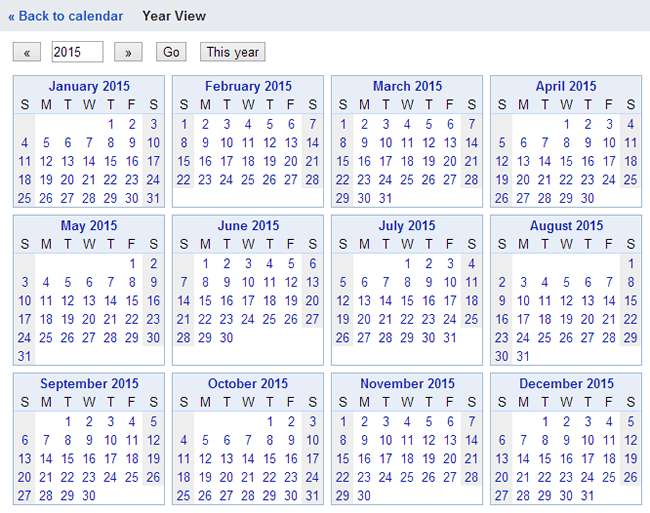 समान रूप से उपयोगी वर्ष दृश्य ऐड-ऑन है जिसे उसी साइडबार के माध्यम से एक्सेस किया जा सकता है। आपको लग सकता है कि डिफ़ॉल्ट दिन, सप्ताह और महीने के दृश्य बहुत अधिक प्रतिबंधात्मक हैं, लेकिन यहां आप वर्ष को एक नज़र में देख सकते हैं। एक वर्ष टाइप करें, गो को हिट करें और आप यह देख सकते हैं कि 3 नवंबर 2015 को कौन सा दिन है (यह एक मंगलवार है, वैसे) और उस तिथि तक जल्दी से कूदें।