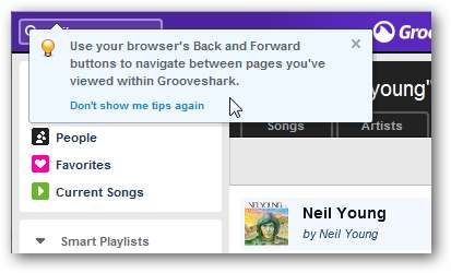 जब आप Grooveshark का उपयोग करना शुरू करते हैं, तो यह सेवा का उपयोग करने में मदद करने के लिए विभिन्न गुब्बारा युक्तियों को पॉपअप करेगा। यदि आप उन्हें नाराज करते हैं तो आप उन्हें नहीं दिखाने का चयन कर सकते हैं।