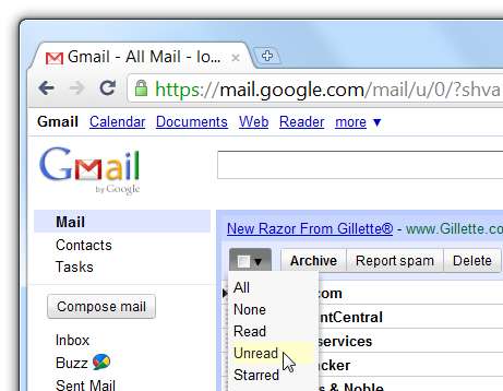 जैसे हम ऊपर उल्लेख कर रहे थे, यदि आप ड्रॉप-डाउन का उपयोग करते हैं और सूची से "अपठित" चुनते हैं, तो यह सब करने जा रहा है सूची में अपठित संदेशों के बगल में स्थित चेकबॉक्स का चयन करें - जो आपके इनबॉक्स को साफ करने के लिए उपयोगी नहीं है।