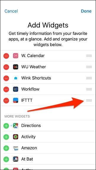 शीर्ष पर वापस स्क्रॉल करें और विजेट अब सक्रिय विजेट की सूची में होगा। आप विजेट के उस स्थान पर दाईं ओर ले जा सकते हैं, जहां आप विजेट स्थित चाहते हैं। यह डिफ़ॉल्ट स्थान सबसे नीचे होगा। समाप्त होने पर शीर्ष-दाएं कोने में "पूर्ण" टैप करें।