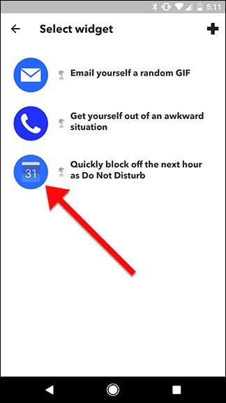 एक बार जब आप छोटे विजेट को छोड़ देते हैं, तो आपको उस एप्लेट को चुनना होगा जिसे आप विजेट को टैप करते समय चलाना चाहते हैं। सूची में से एक चुनें। इस उदाहरण में हम Google कैलेंडर ऐपलेट के रूप में "अगले घंटे बंद न करें के रूप में त्वरित रूप से अवरुद्ध करें" का उपयोग कर रहे हैं।