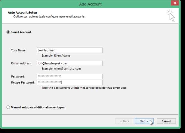 खाता जोड़ें संवाद बॉक्स में, आप ई-मेल खाता विकल्प चुन सकते हैं जो आउटलुक में अपने जीमेल खाते को स्वचालित रूप से सेट करता है। ऐसा करने के लिए, अपना नाम, ईमेल पता और अपने जीमेल खाते का पासवर्ड दो बार दर्ज करें। अगला पर क्लिक करें। (यदि आप दो-कारक प्रमाणीकरण का उपयोग कर रहे हैं, तो आपको इसकी आवश्यकता होगी इस पेज से एक "ऐप पासवर्ड" प्राप्त करें .)