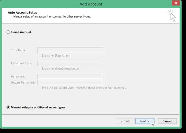 यदि स्वचालित प्रक्रिया विफल हो जाती है, तो ई-मेल खाते के बजाय मैन्युअल सेटअप या अतिरिक्त सर्वर प्रकारों का चयन करें, और अगला क्लिक करें।