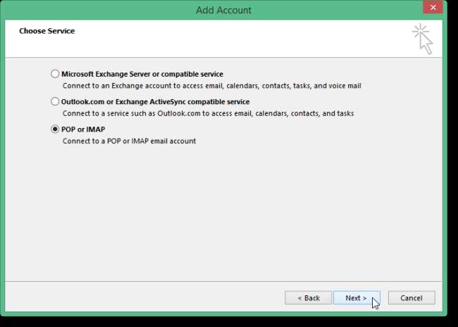 सेवा स्क्रीन चुनें पर, POP या IMAP चुनें और अगला क्लिक करें।