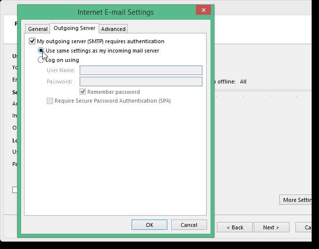 इंटरनेट ई-मेल सेटिंग संवाद बॉक्स में, आउटगोइंग सर्वर टैब पर क्लिक करें। मेरा निवर्तमान सर्वर (SMTP) का चयन करें प्रमाणीकरण की आवश्यकता है और सुनिश्चित करें कि मेरे आने वाले मेल सर्वर विकल्प के रूप में एक ही सेटिंग का उपयोग करें।