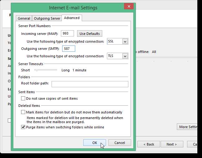 अभी भी इंटरनेट ई-मेल सेटिंग संवाद बॉक्स में, उन्नत टैब पर क्लिक करें। निम्नलिखित जानकारी दर्ज करें: